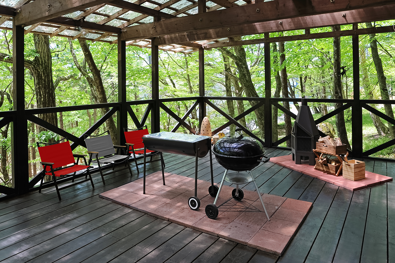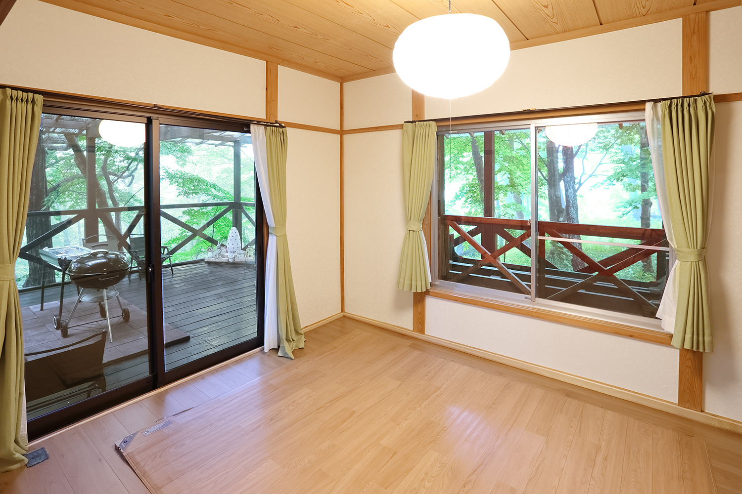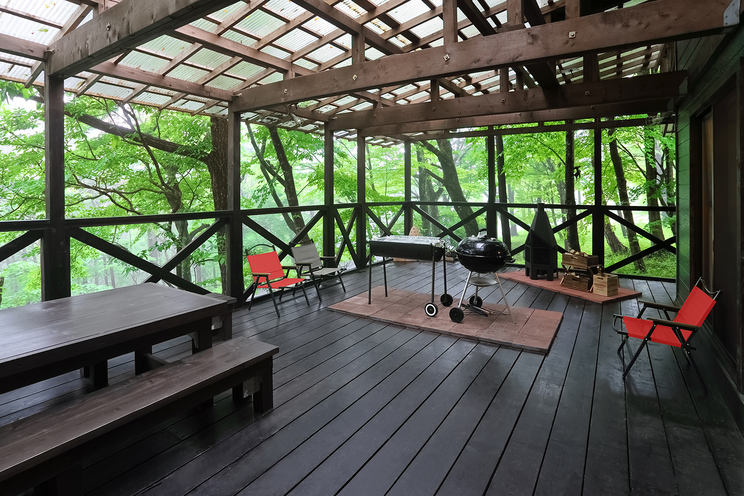 さぁこの広~いデッキでBBQ・焚火・星を愛でる。ふりそそぐ光と心地よい風に吹かれながら、周りの景色をお楽しみください。ログ調の館内がステキです。